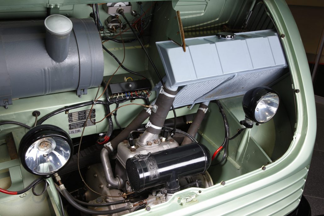 Das erste Modell der Auto Union in Ingolstadt nach dem Zweiten Weltkrieg war kein Personenwagen, sondern der DKW “Schnellaster”. Die Auto Union hatte schnell erkannt, daß der Bedarf an Kleintransportern im Nachkriegsdeutschland enorm sein wird. Schon 1949 und somit ein Jahr früher als der VW Bus T 1 erschien der Transporter F 89 L. Die Grundkonstruktion des Schnellasters basierte auf der bewährten DKW-Vorkriegstechnik mit 2-Zylinder Zweitaktmotor, Frontantrieb und kompakter Hinterachse. Dadurch waren viele Aufbauvarianten möglich: Kleinbus, Kastenwagen, Pritsche, Verkaufswagen, Krankenwagen, Viehtransporter und verschiedene Sonderaufbauten. Unser Ausstellungsfahrzeug “DKW-Kundendienst” stammt aus der letzten Serie der Baureihe namens F 800/3 und verfügt über einen kräftigen 3-Zylinder Zweitaktmotor mit 32 PS und 4-Gang-Getriebe. Der geräumige Kastenaufbau fasste ein Volumen von 5 m³ bei einer Zuladung von 800 kg. Mit 90 km/h Höchstgeschwindigkeit machte der Schnellaster seinem Namen alle Ehre.
