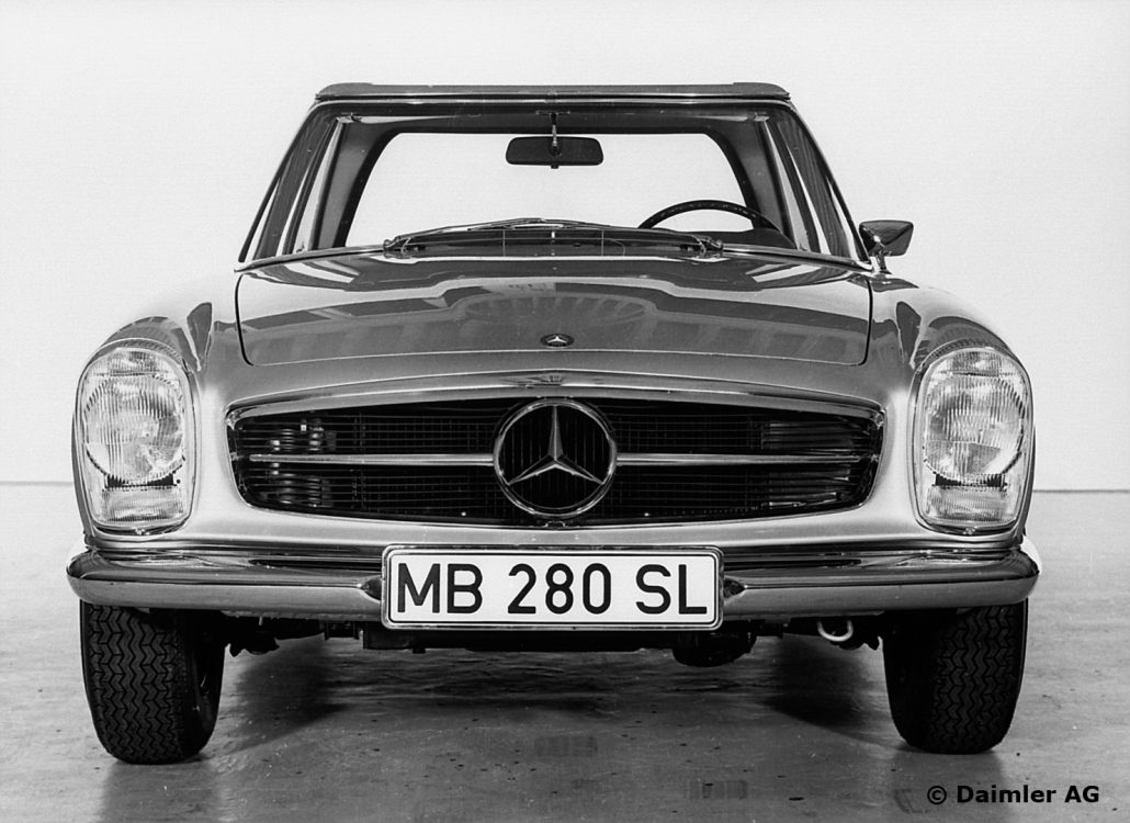 Der “Pagoden-Mercedes” – SL (Pagode = Dachform japanischer Tempel) erhielt diesen Spitznamen von der auffälligen konkaven Krümmung des optional lieferbaren Kunststoff-Hardtops für den Winterbetrieb. Das Ziel der Gestalter war es, durch die Krümmung des Daches mehr Freiraum für die Köpfe der Passagiere zu schaffen und gleichzeitig die Stabilität zu erhöhen. Nach den gewohnt rundlichen Formen der fünfziger Jahre überraschte die „Pagode“ nun mit geraden und schlichten Linien. Die erste „Pagode“, der 230 SL, verkaufte sich auf Anhieb fast doppelt so gut wie der Vorgänger 190 SL. Im Vergleich zu diesem erreichte der neue SL nun endlich Fahrleistungen auf Sportwagen-Niveau. 1967 erschien der 250 SL mit vergrößerem Hubraum und mehr Drehmoment auf dem Markt; schon ein Jahr später war der 280 SL mit 170 PS erhältlich. Acht Jahre lang blieb der beliebte Pagoden-Mercedes im Programm und wurde mit fast 50.000 produzierten Exemplaren zu einem großen Erfolg, v.a. in Nordamerika. Viele Fahrzeuge haben dort in Regionen mit trockenem Klima überlebt und sind inzwischen wieder von Liebhabern zurück nach Deutschland gebracht worden. Der 60er-Jahre SL überzeugt heute durch seine elegante Zeitlosigkeit und gehört zu den beliebtesten Klassikern überhaupt.
